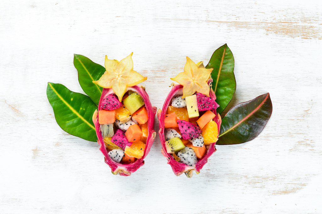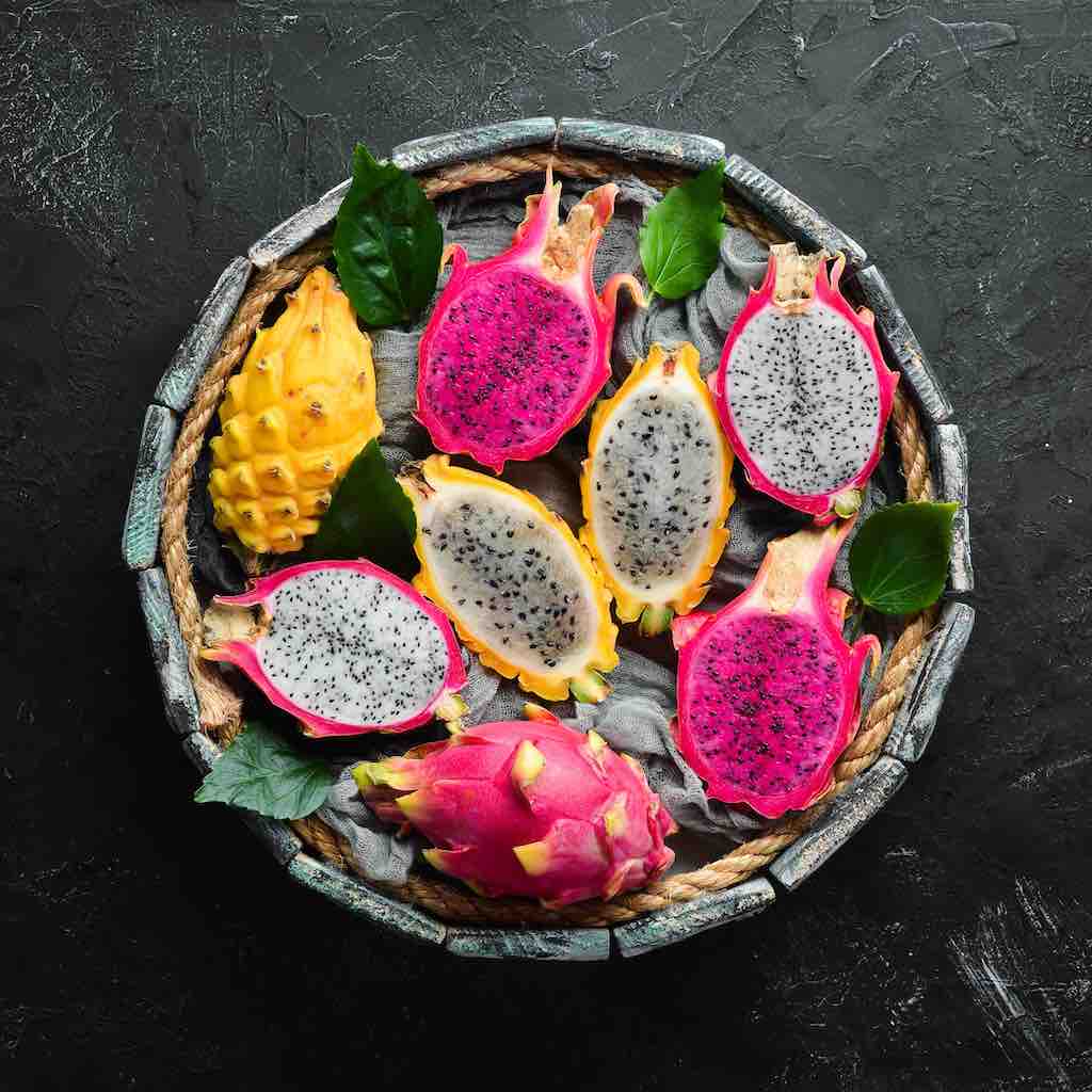 Native to Central America but grown all over the world, including right here in Hawaii, dragonfruit—also known as pitaya—has a spiky looking outer skin (only the yellow has spikes that Iʻve seen) and a sweet, seed-speckled interior. The fruit comes in three main varieties: white flesh with pink skin, red flesh with pink skin, and white flesh with yellow skin.
