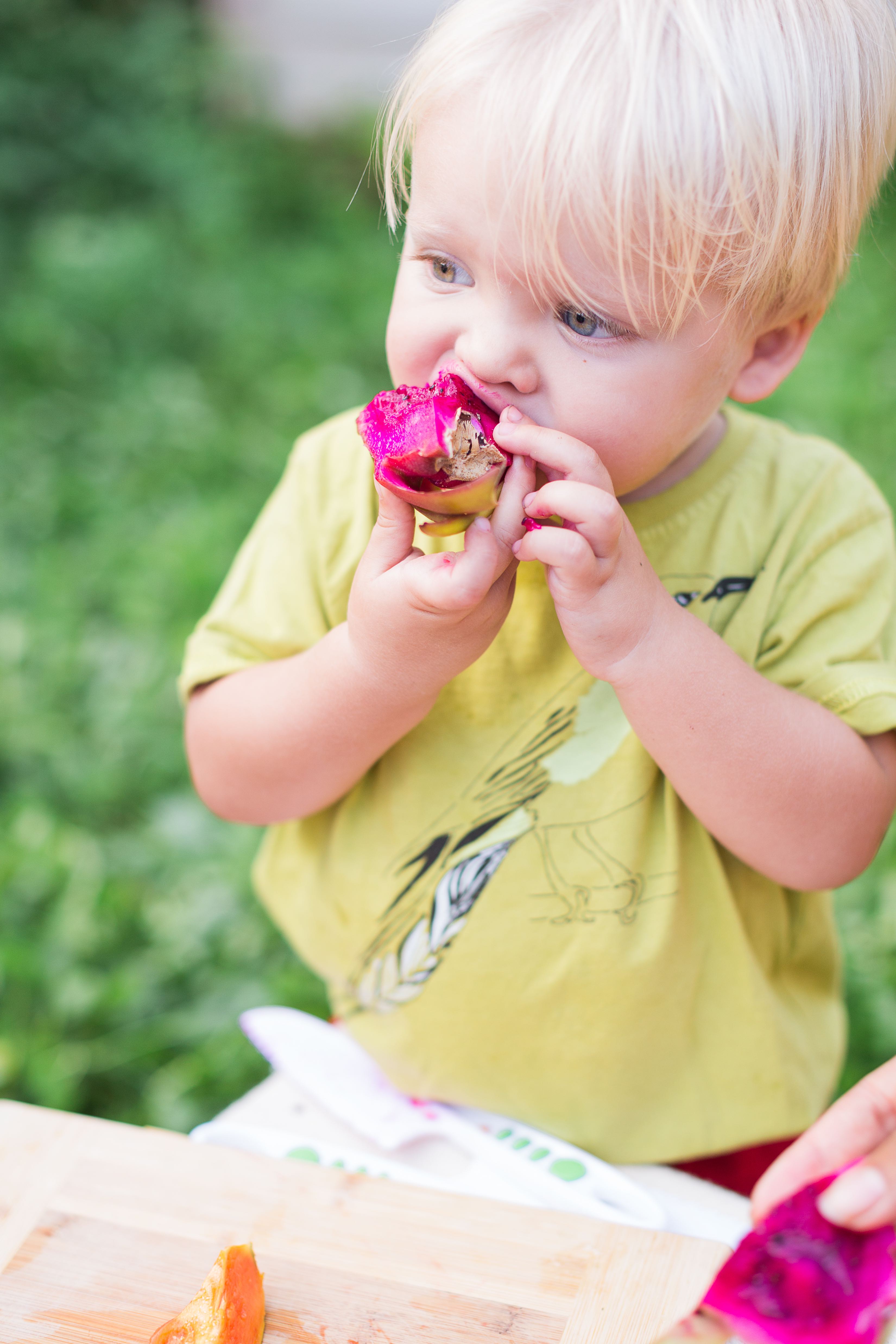 When doing a dragonfruit taste test with preschoolers, offer a large piece where they can remove the peel and slice on their own. It is very soft so they can use a nylon, plastic, or steel butter knife. Alternatively, provide small bite-sized pieces. Preparing their own food often increases the likelihood of them tasting it!